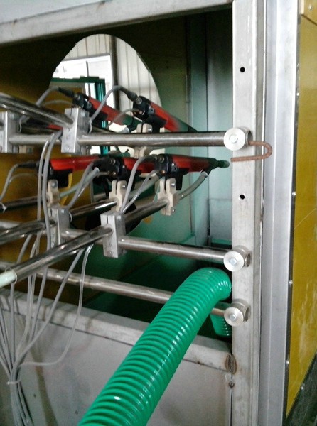 主要特點(diǎn):噴涂方式可采用手動(dòng)、自動(dòng)或手動(dòng)+自動(dòng)。噴料100%是固體粉末,游離的粉末可以回收利用,涂料回收利用率可達(dá)98%。懸吊運(yùn)輸系統(tǒng),自動(dòng)化程度高。涂層微孔少,防腐性能好,并可一次進(jìn)行厚膜噴涂。